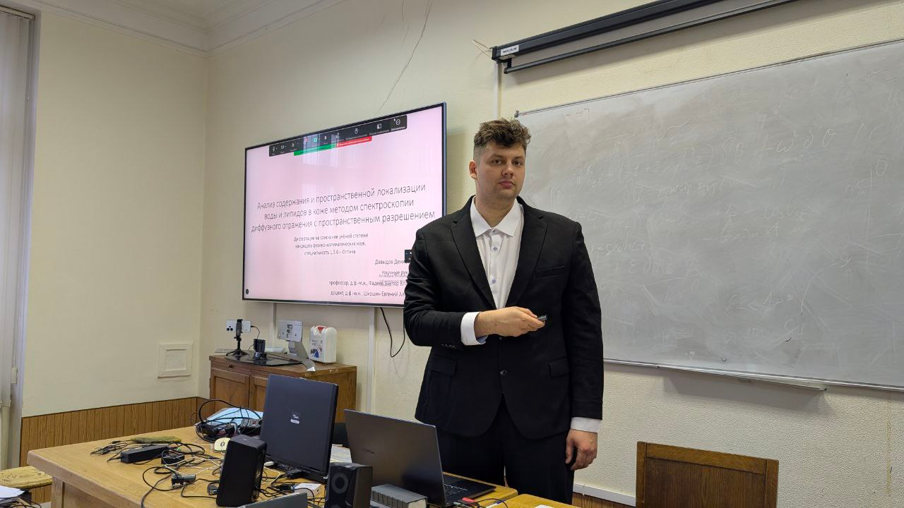 25 ноября м.н.с. лаборатории Денис Давыдов защитил кандидатскую диссертацию "Анализ содержания и пространственной локализации воды и липидов в коже методом спектроскопии диффузного отражения с пространственным разрешением".